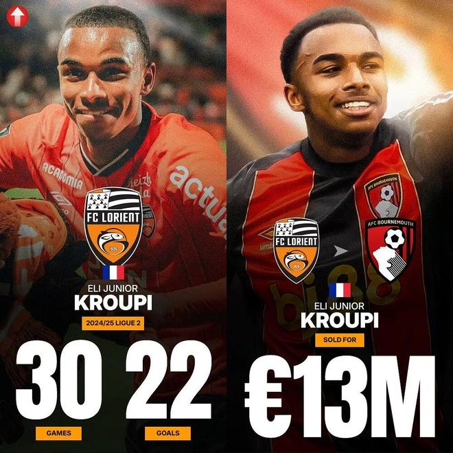 现如今,19岁的法国前锋克鲁皮很可能会步前辈们的后尘,成为伯恩茅斯下一位加盟豪门的球星。2025年2月,伯恩茅斯仅花费1300万欧元从法乙洛里昂签下克鲁皮,并在夏天正式加盟球队。而他在加盟球队之后,近3次英超出场狂轰4球,表现优异。