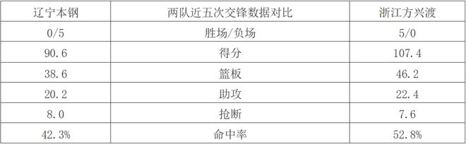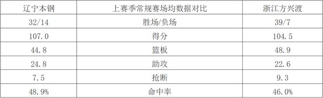 主要球员上赛季数据:辽宁本钢:威尔斯:上赛季常规赛出战36场,场均上场32.7分钟,得到21.3分、3.7个篮板、4.0次助攻。姜宇星:上赛季常规赛出战7场,场均上场35.3分钟,得到12.7分、3.7个篮板、2.0次助攻、1.1次抢断。付豪:上赛季常规赛出战45场,场均上场25.8分钟,得到11.1分、5.3个篮板、1.3次助攻。浙江方兴渡:胡金秋:上赛季常规赛出战44场,场均上场32.7分钟,得到19.1分、8.3个篮板和1.4次助攻。孙铭徽:上赛季常规赛出战33场,场均上场33.2分钟,得到14.8分、2.9个篮板、9.5次助攻和2.6次抢断。赵嘉仁:上赛季常规赛出战46场,场均上场24.8分钟,得到8.1分、2.8个篮板和1.2次助攻。里程碑数据:辽宁本钢:埃里克·莫兰德CBA生涯盖帽总计为376次,位列CBA历史盖帽榜第26位,距离第25位的兰多夫·莫里斯(378次)还差2次。李晓旭CBA生涯抢断总计为639次,位列CBA历史抢断榜第28位,距离第27位的杨鸣(644次)还差5次。付豪CBA生涯篮板总计为2560个,位列CBA历史篮板榜第38位,距离第37位的周鹏(2579个)还差19个。埃里克·莫兰德CBA生涯篮板总计为2343个,位列CBA历史篮板榜第47位,距离第46位的罗德·格里格尔(2344个)还差1个。浙江方兴渡:孙铭徽CBA生涯助攻总计为2597次,位列CBA历史助攻榜第4位,距离第3位的郭艾伦(2646次),还差49次。胡金秋CBA生涯盖帽总计为423次,位列CBA历史盖帽榜第22位,距离第21位的闫鹏飞(427次)还差4次。赵岩昊CBA生涯抢断总计为572次,位列CBA历史抢断榜第41位,距离第40位的林志杰(576次)还差4次。