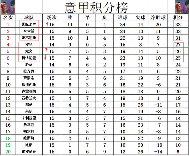 - 意甲 | 积分榜丨前四名分差仍在2分以内